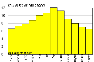 הממוצע החודשי של מספר שעות ביום של אור שמש. |